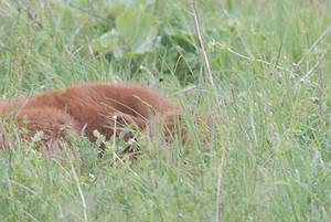 auf den Bildern auch ein Neugeborenes was nach den Geburtsstrapazen stundenlang im Gras liegt. Die einzige Bewegung die ab und zu zu beobachten ist, das Kuhradar welches sensibel (-: auf Geräusche in der Umgebung achtet und besonders auf anschleichende Zweibeiner mit Piercingzange lauscht und innerhalb weniger Bruchteile einer Sekunde von Schlaf auf 40km/h beschleunigt.